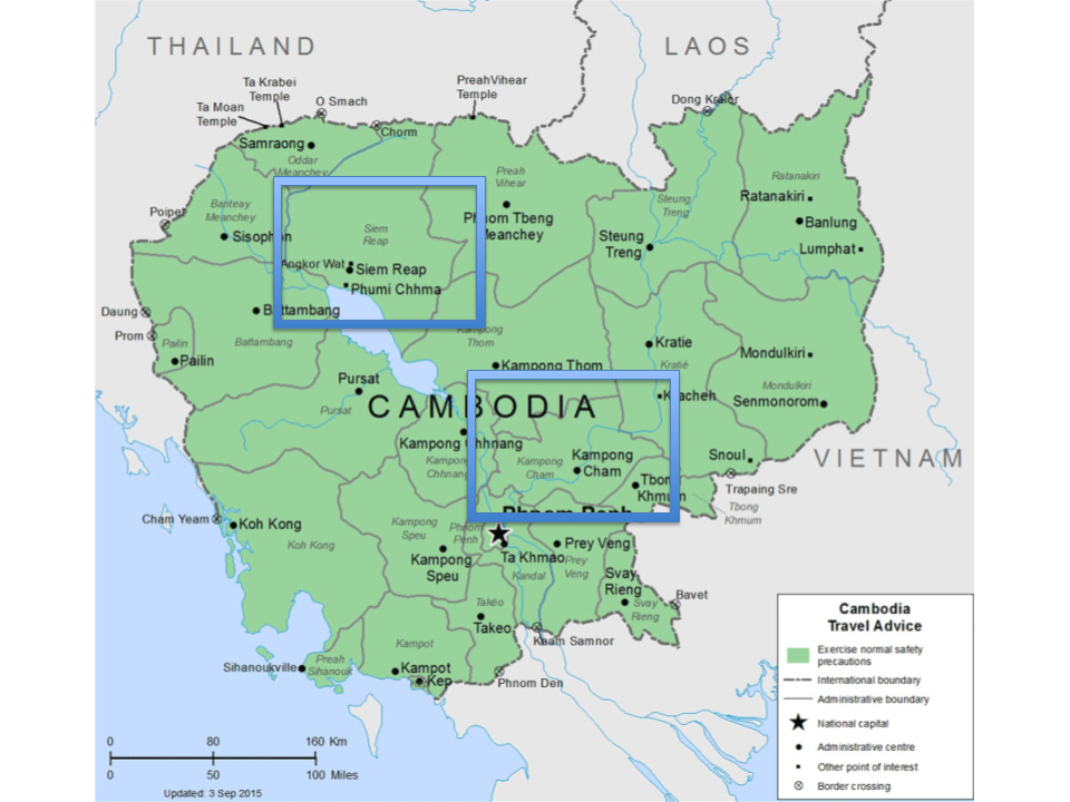 ANRS 12384 Cam-C was a two-arm cluster-randomized controlled trial. It was conducted in the Kampong Cham and Siem Reap Provinces. A total of 8 geographical areas were selected: 4 in each province to be part of arm 1 (facility-based) and arm 2 (community-based). A cluster was defined as a group of 50 households resulting in 160 clusters: i.e., 80 per province, 20 per geographical area.