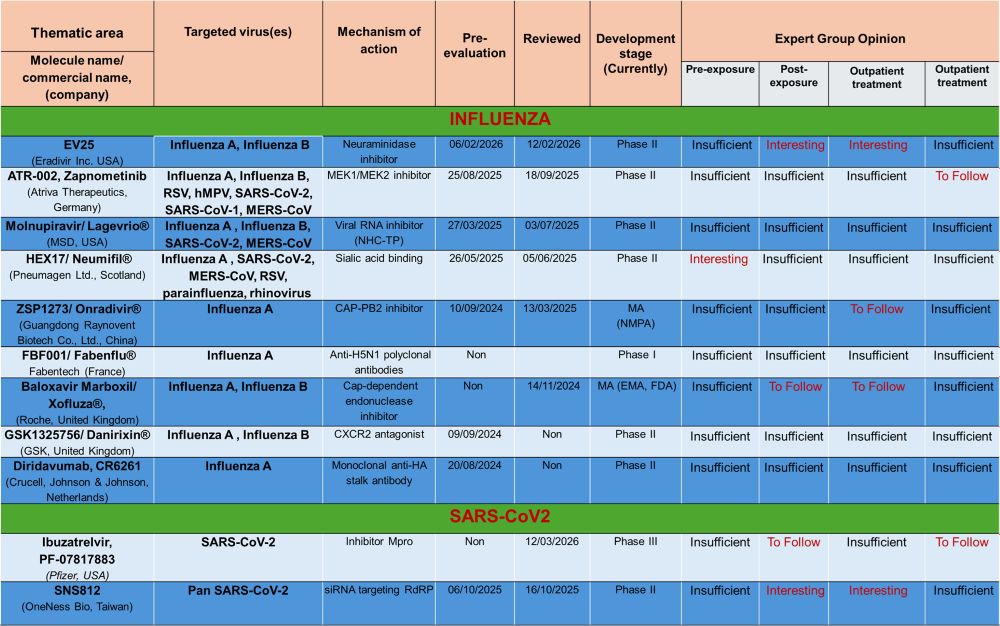 This table summarizes the AvATher Working Group’s expert assessments of antiviral agents and antibodies targeting respiratory viruses. Evaluations are based on available scientific evidence (preclinical and clinical data) and, where applicable, on exchanges with the respective companies.