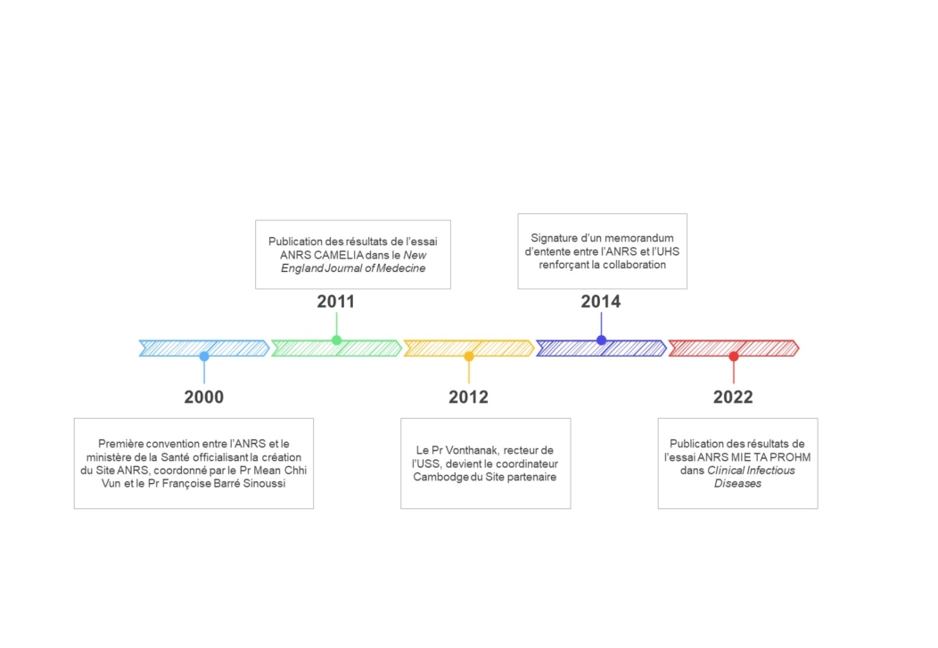 Les premières collaborations franco-cambodgiennes ont débuté en 1995. Le partenariat s’est concrétisé en 2000 par la signature d’un accord-cadre entre le ministère de la Santé du Cambodge, l’ambassade de France au Cambodge et l’ANRS MIE.
