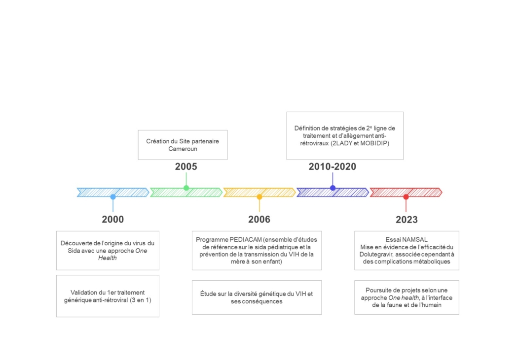 Depuis le lancement en 1994 du projet PRESICA soutenu par l’ANRS MIE, initiative visant à approfondir les connaissances du VIH-1 en Afrique, les équipes de recherche franco-camerounaises ont mené de nombreuses recherches majeures sur les maladies infectieuses, notamment le VIH. Parmi celles-ci, la cohorte PEDIACAM a démontré l’impact d’une multi-thérapie antirétrovirale précoce chez les nourrissons infectés par le VIH, fournissant encore aujourd’hui des données cliniques et sociales cruciales pour l’amélioration des protocoles pédiatriques. Le projet NAMSAL a, quant à lui, démontré que le dolutégravir était une alternative efficace et bien tolérée pour les traitements de première intention dans les pays à ressources limitées.