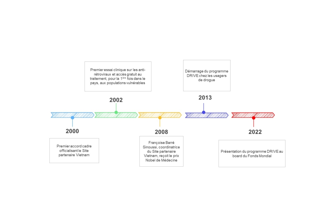 L’ANRS signe un premier accord de col­laboration en 1995 avec le ministère de la Santé du Vietnam. Le Site partenaire ANRS au Vietnam est officiellement créé le 6 janvier 2000. L’accord de coopération entre le ministère de la Santé du Vietnam et l’ANRS a été renouvelé et mis à jour le 18 janvier 2018, confirmant la volonté commune de poursuivre la collaboration.