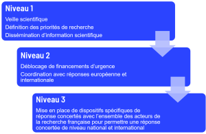 • Niveau 3 : En cas de crise nécessitant une coordination renforcée de niveau national, mise en place de dispositifs spécifiques de réponse concertés avec l’ensemble des acteurs de la recherche française.