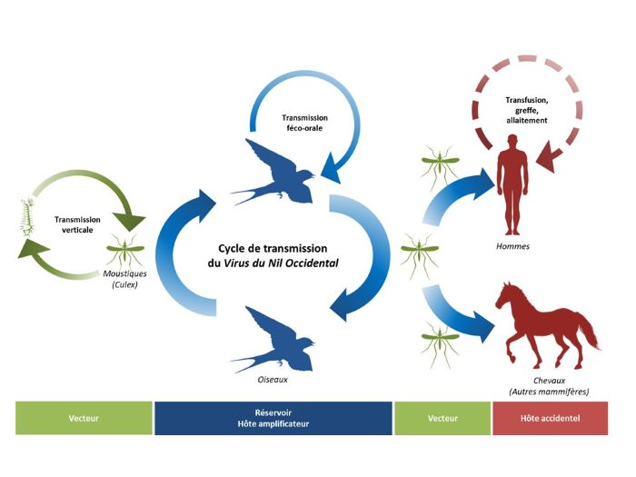 Les oiseaux constituent le principal réservoir du virus et sa transmission entre oiseaux virémiques et non infectés est majoritairement assurée par des femelles moustiques du genre Culex.17